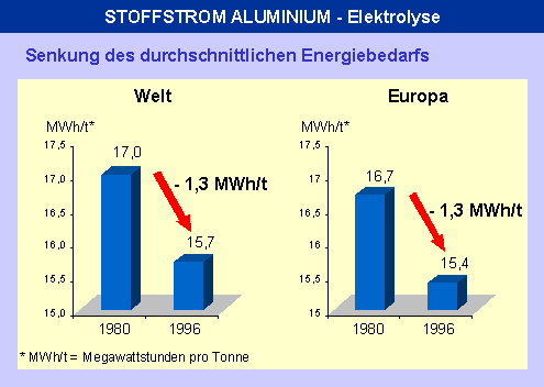 :: Die Energieeffizienz ist mit Beginn der industriellen Aluminiumproduktion kontinuierlich verbessert worden. Wurden vor einigen Jahrzehnten noch 21 Kilowattstunden Strom je Kilogramm Hüttenaluminium eingesetzt, beträgt der durchschnittliche Stromverbrauch mittlerweile rund 15 kWh/kg - eine Einsparung von fast 30 Prozent. Im Rahmen einer Selbstverpflichtung der deutschen NE-Metallindustrie hat die deutsche Aluminiumindustrie darüber hinaus zugesagt, ihren Beitrag zur Senkung des spezifischen Energieverbrauches bis zum Jahre 2005 um weitere 22 % zu leisten (Bezugsjahr 1990).